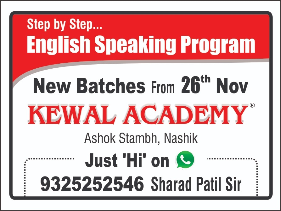 1) Highest rated spoken English Institute in nashik. 2) Top English speaking class in nashik. 3) No 1 spoken English speaking class in Nashik. 4) Personality Development class 5) Memory Techniques 6) Read the reviews on just dial about Kewal Academy. 7) The most favorite spoken English institute for students New batches from 26 November 9 to 10 AM / 7 to 8 PM