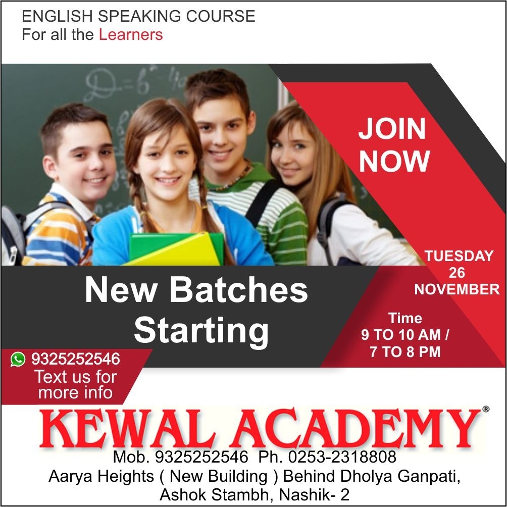 ENGLISH मध्ये पेपर लिहायला अवघड जातो का ? 1) १००% रिझल्ट ? 2) इंग्रजी समजत पण बोलायला अवघड वाटते का ? 3)इंग्रजीचा पेपर पाठांतर करून लिहावा लागतो का ? 4) इंग्रजीत मुलाखत अवघड वाटते का ? Friends , All theses problems if you are facing then must visit to Kewal Academy . Thousands of students have visited and learned to speak English on stage at Kewal Academy . The most of the students after completing their English speaking course , working in foregin countries and enjoying . Grab this opportunity to speak English.New batches from 26 November Morning 9 to 10 / Evening 7 to 8