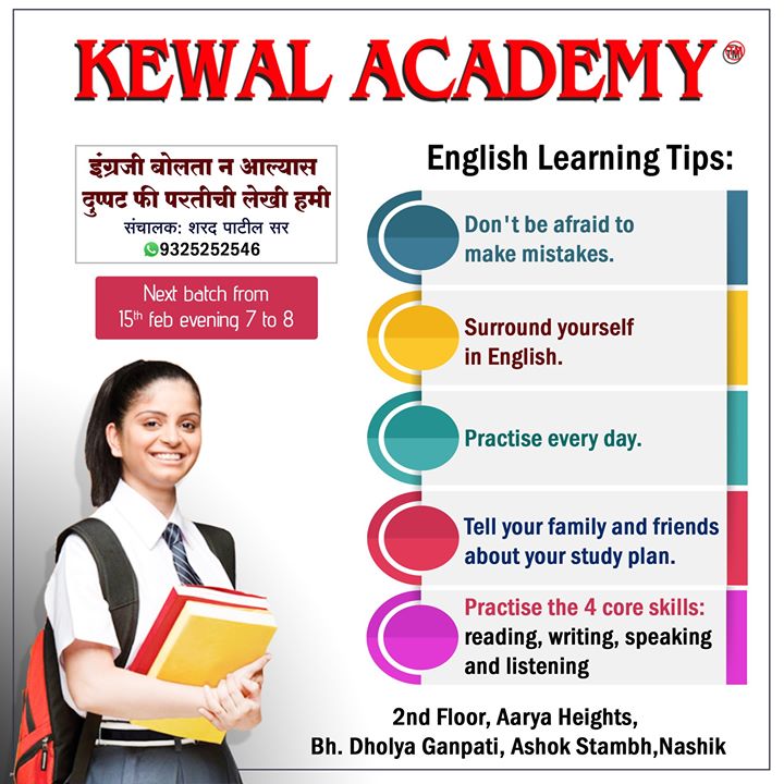 Kewal Academy always Guides Students who have interest in learning English and developing their personality.Hurry up! New batches are starting from 15th February 2018. For more information please visit 2nd floor, Aarya heights, Behind Dholya Ganpati, Ashok Stambha, Nashik Contact : 9921230000, 9325252546 #KewalAcademy #NewBatch #Starts #15th #Februaury #Kewal #Classes #EnglishSpeaking #Buid #Personality #Confidence #Perfect #CommondOnEnglish #LearnEnglishSpeaking #EnglishClasses
