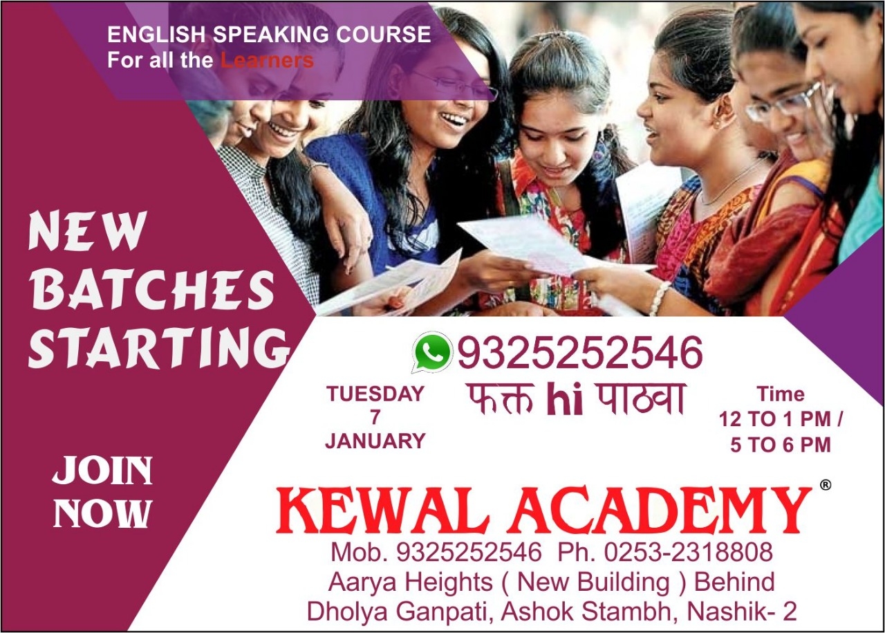 Kewal Academy , Ashok stambh ( NSK) 1)No.1 English speaking Academy in nashik 2) Practice sessions on different topics 3)Body language 4)Vocal varienty 5) Personality Development 6) Memory Techniques 8) Interview Techniques Admissions started for up coming batches 7 January Morning 12 to 1 PM / evening 5 to 6 Hurry Up only 20 seats in a batch For more information call on 9325252546