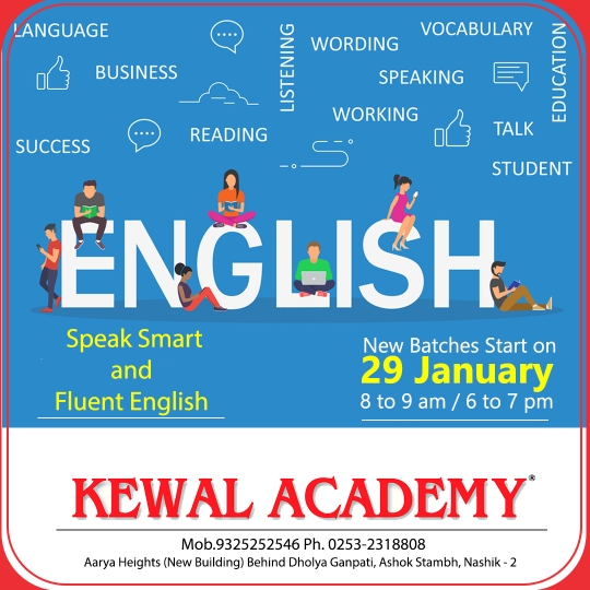 Kewal Academy , Ashok stambh ( NSK) 1)No.1 English speaking Academy in nashik 2) Practice sessions on different topics 3)Body language 4)Vocal varienty 5) Personality Development 6) Memory Techniques 8) Interview Techniques Admissions started for up coming batches 29 January Morning 8 to 9 AM / evening 6 to 7 Hurry Up only 20 seats in a batch For more information call on 9325252546.