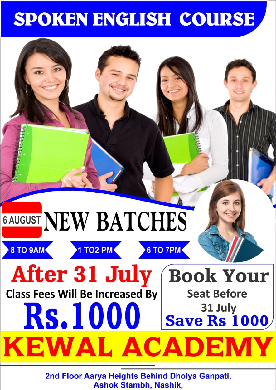 Kewal Academy SPOKEN ENGLISH COURSE Admission Open Book Your Seat before 31 July and save Rs. 1000/- After 31 July class fees will be increased by Rs.1000 New Batches start from 6th August 2019 Batch time 8 to 9 AM 1 to 2 PM 6 to 7PM 👇 @kewalacademy123 #english #speakenglish #course #offer #personality #pronunciation #competitive #personalitydevelopment #nashik #learning #education #learn #school #teaching #art #teacher #motivation #study #student #reading #training #knowledge #students #english