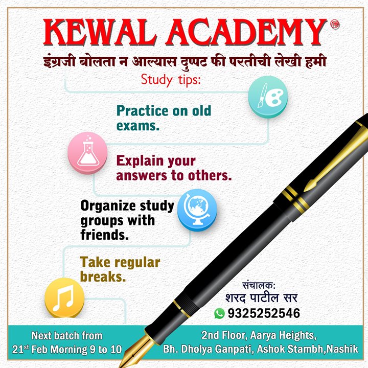 Practice on old exams. Explain your answers to others. Organize study groups with friends. Take regular breaks #KewalAcademy #NewBatch #Starts #21st #Februaury #Kewal #Classes #EnglishSpeaking #Buid #Personality #Confidence #Perfect #CommondOnEnglish #LearnEnglishSpeaking #EnglishClasses