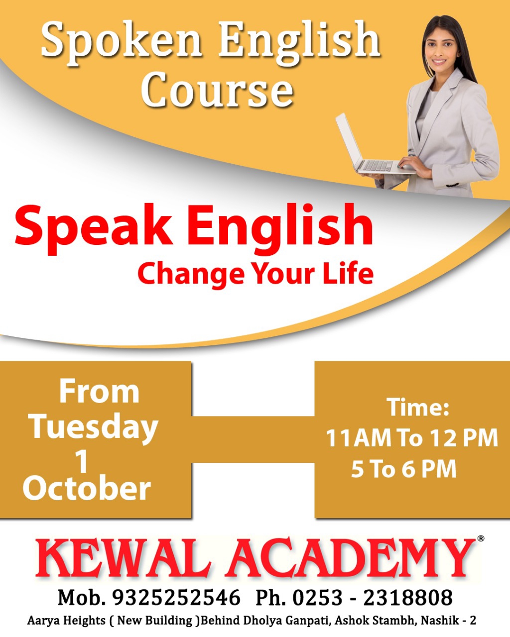 SPOKEN ENGLISH INSTITUTE IN NASIK September batches are full . Next month Advanced booking started . Batches will start from 1 October Time : 11 to 12 PM & 05 to 06 PM. Only FEW SEATS are left . 1)Basic English Speaking 2)English Vocabulary Development 3)Advanced English training 4)Spoken English institute 5)English Speaking course , 6)personality Development , 7)Memory techniques, 8)English story Narration 8)Interview techniques 9)Role play conversation in English HIGHLIGHTS:- 1) Highly Competitive Environment 2) Audio - visual hall 3) 1 Year Membership 4) A.C. classroom WHO CAN JOIN THIS COURSE:- This spoken English course is good for college students, workers , managers , teachers , housewives, government employees