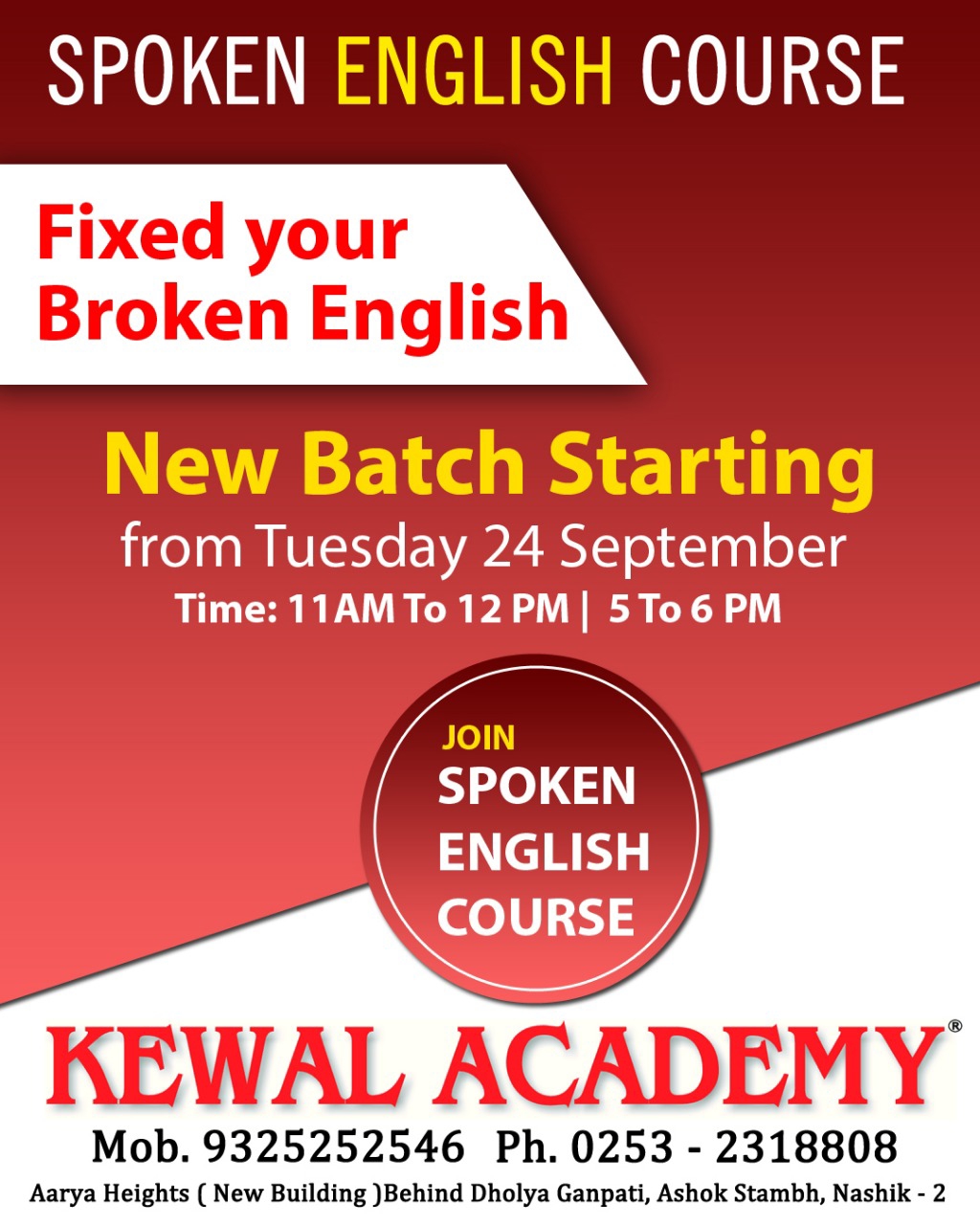 WANNA SPEAK FLUENT ENGLISH ? नाशिक मध्ये ENGLISH SPEAKING साठी चांगला क्लास शोधता आहे का?. Just Dial वर नाशिक जिल्ह्यात सर्वात जास्त ratings असलेला KEWAL ACADEMY. PROF. SHARAD PATIL 1) ENGLISH SPEAKING / COMMUNICATION COURSE 2) GROUP DISCUSSION 3) PERSONALITY DEVELOPMENT 4) INTERVIEW TECHNIQUES 5) ENGLISH VOCABULARY DEVELOPMENT 6) MEMORY TECHNIQUES 7) CONSCIOUS AND SUBCONSCIOUS TECHNIQUES 8) REMOVE YOUR STAGE FEAR 9) POSITIVE ATTITUDE 10) STORY NARRATION 11) ROLE PLAY ENGLISH CONVERSATIONS ON STAGE